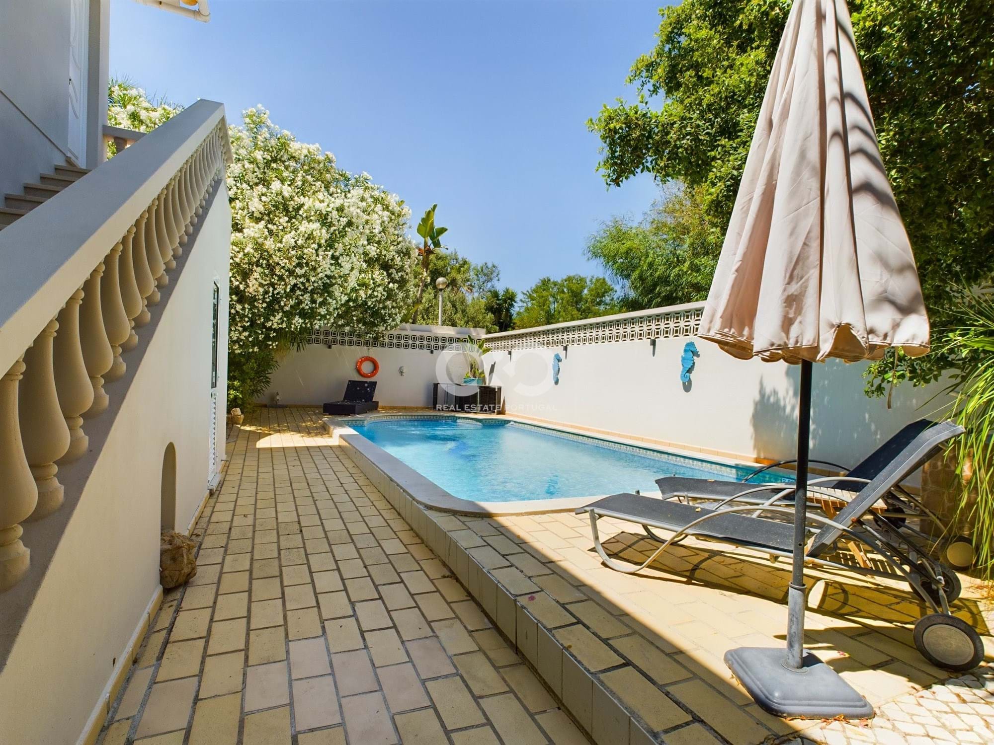 Its cozy outdoor space with mature trees and swimming pool completes the offer of this house.